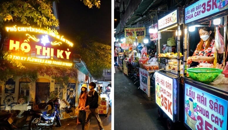 Đường Ẩm Thực Hồ Thị Kỷ là một không gian sống động nơi những hương thơm, âm thanh và sắc màu hòa vào nhau tạo thành nhịp điệu rất riêng. Con hẻm chỉ dài vài trăm mét nhưng luôn mang cảm giác như một lễ hội nhỏ, nơi từng quầy hàng chen nhau tỏa sáng dưới ánh đèn vàng ấm áp. Nhịp bước người qua lại, giọng rao nheo nhéo, mùi xiên nướng bốc khói làm bạn vừa choáng ngợp vừa háo hức.